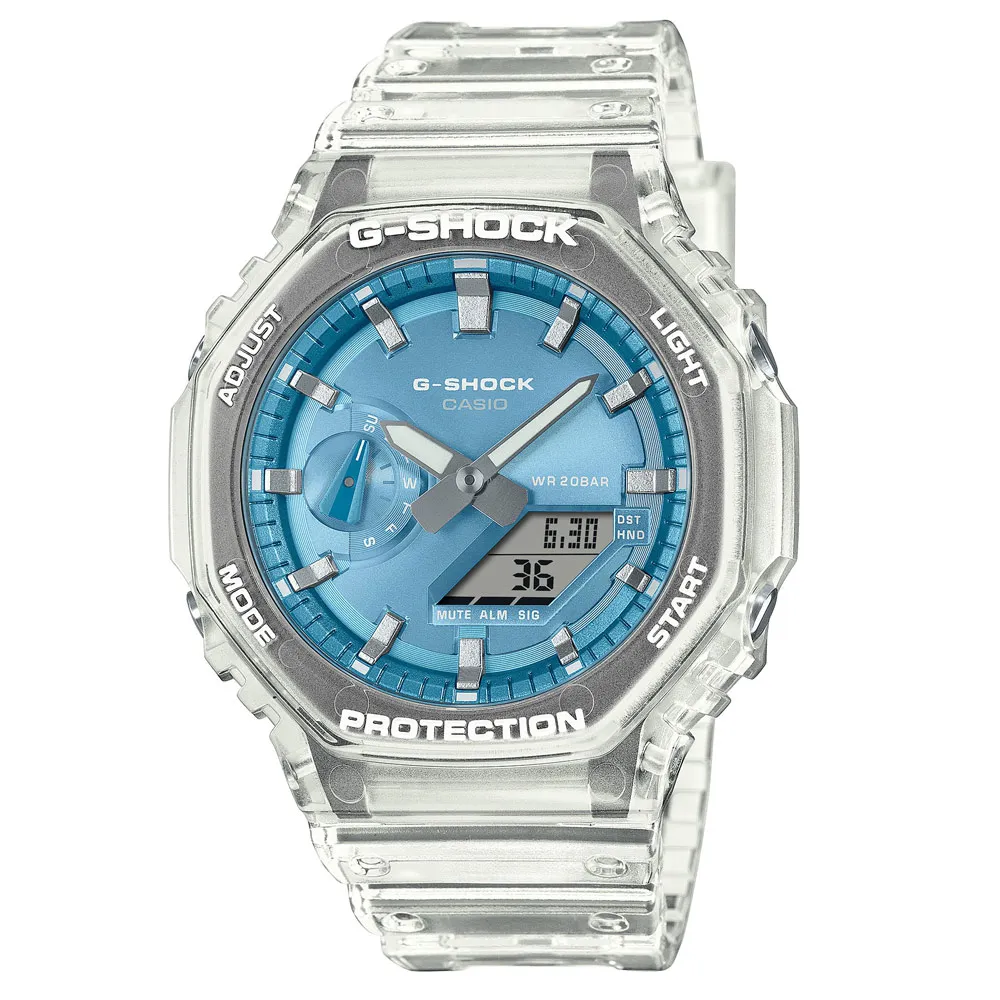 Casio G-Shock Herrenuhr Classic transparent blaues Metallzifferblatt