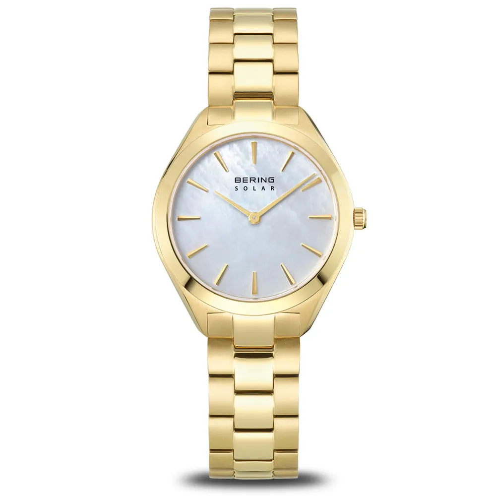 Bering Damenuhr Solar goldfarben mit Gliederband Zifferblatt Perlmutt