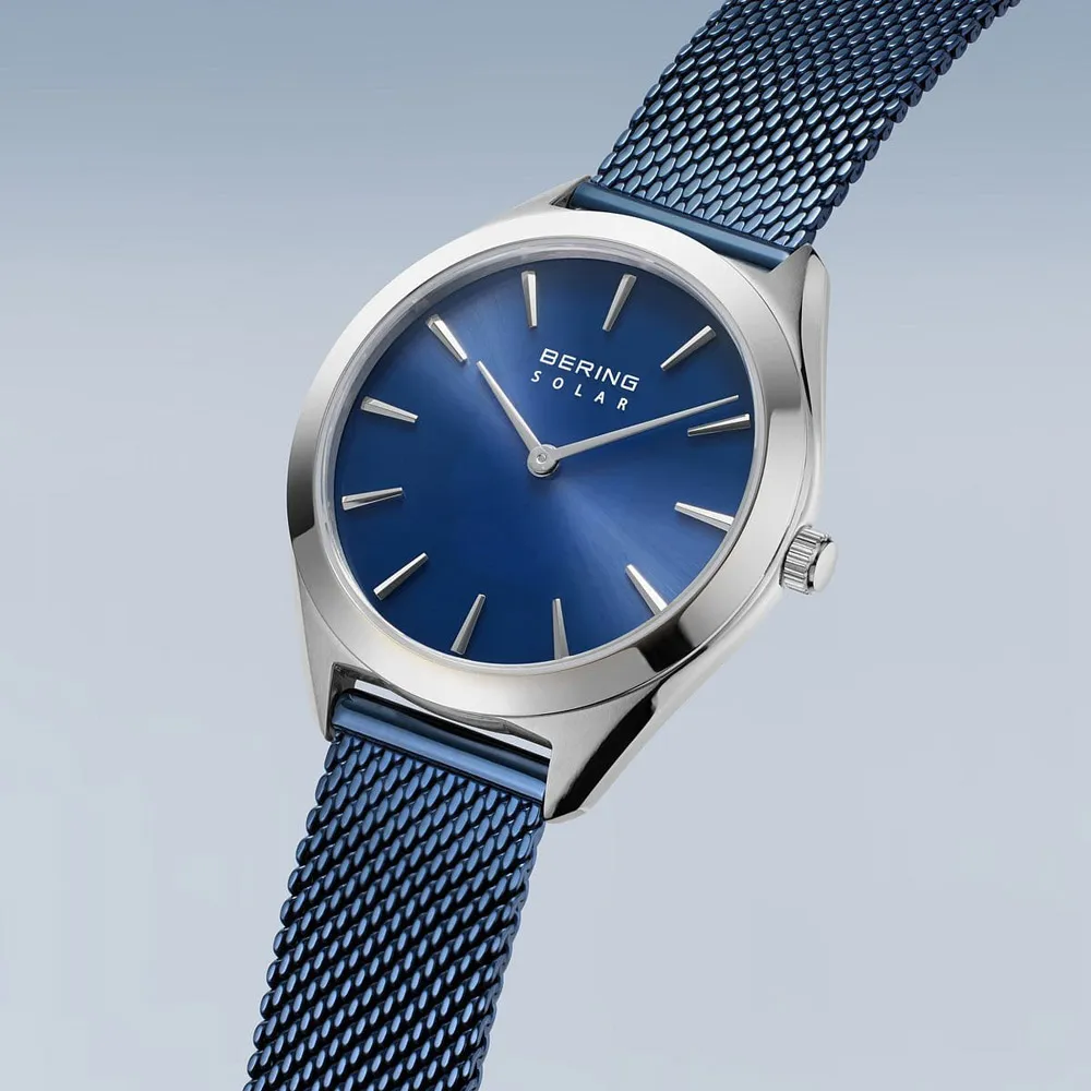 Bering Damenuhr Solar silberfarben mit Milanaiseband blau