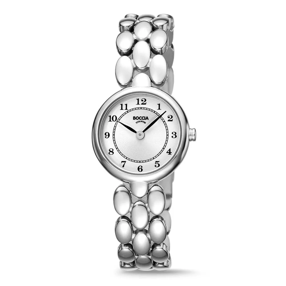 Die Boccia Damenuhr besticht durch ihr klassisches Design aus Titan. Das weiße Ziffernblatt sorgt für eine klare Lesbarkeit, während das robuste Titanband Komfort und Langlebigkeit vereint.